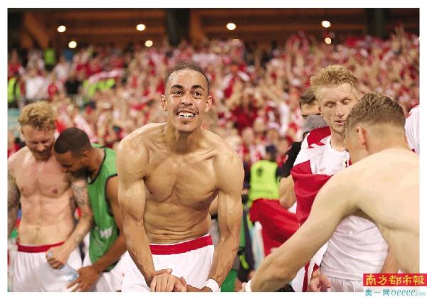 丹麦前锋波尔森和队友一起激情庆祝球队晋级四强。IC图片