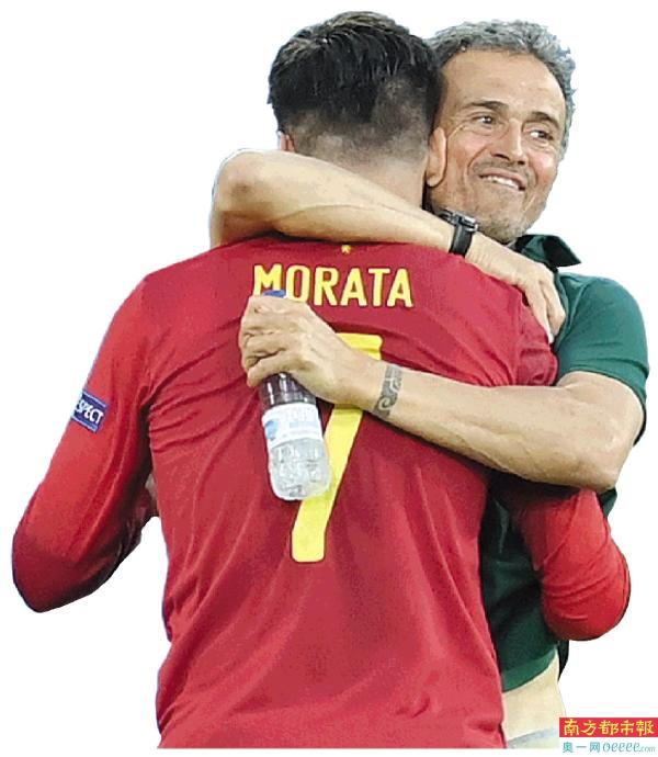 →莫拉塔进球后拥抱恩里克,感谢主教练信任。IC图片