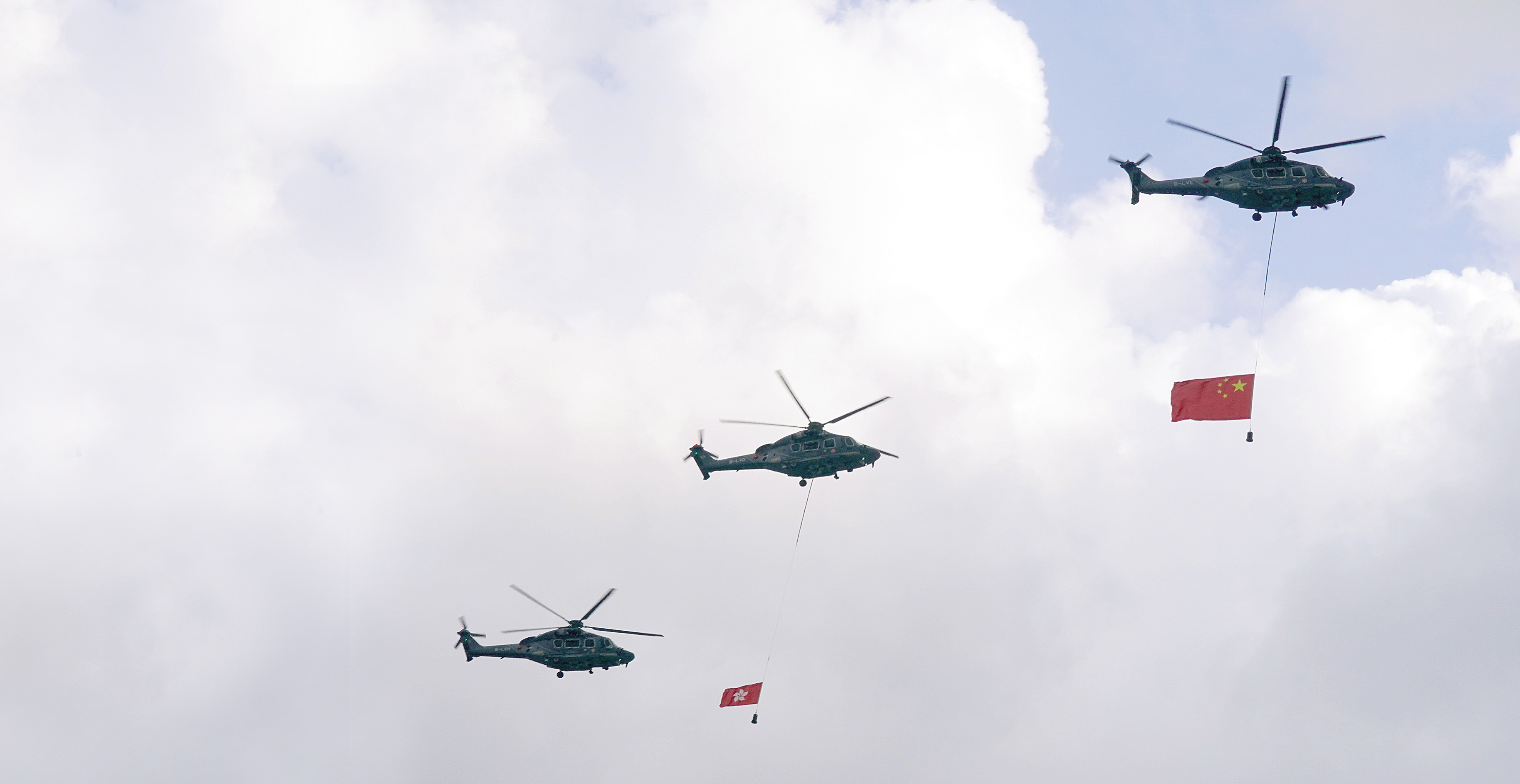2021年7月1日,香港特别行政区政府在金紫荆广场举行升旗仪式,庆祝香港回归祖国及特区成立24周年。图为升旗仪式上直升机悬挂着国旗和区旗飞越维港。 IC供图