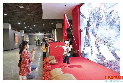 广州艺术博物院院长、研究员王平介绍,本次展览更有“沉浸式”体验,在《飞夺泸定桥》的“打卡”背景图前面,工作人员为观众准备了“手榴弹”、“红军帽”等“道具”,有拍照需求的观众可借用这些道具与“泸定桥”合影。据透露,展览期间,将开放单位团体的预约,并提供讲解服务。