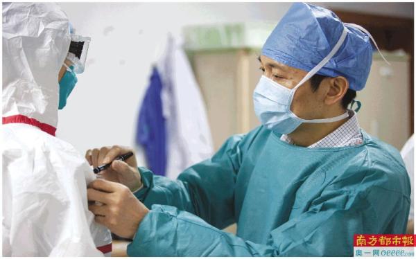 当年轻的队员进入病区时,陈祖辉会用一些肢体语言进行鼓励,帮对方穿戴好防护装备,做好姓名标示;医护从病区下班后,他会从旁迎候,道一句“辛苦”,递上一个新口罩。