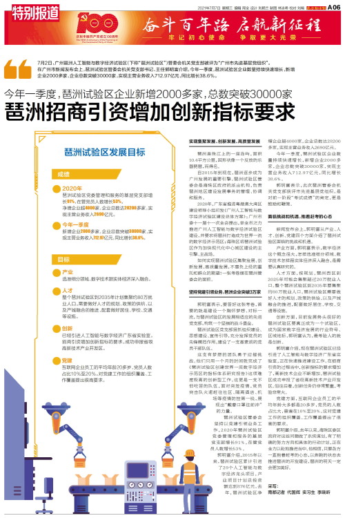 7月2日,广州琶洲人工智能与数字经济试验区(下称“琶洲试验区”)管委会机关党支部被评为“广州市先进基层党组织”。在广州市新闻发布会上,琶洲试验区管委会机关党支部书记、主任郭明富介绍,今年一季度,琶