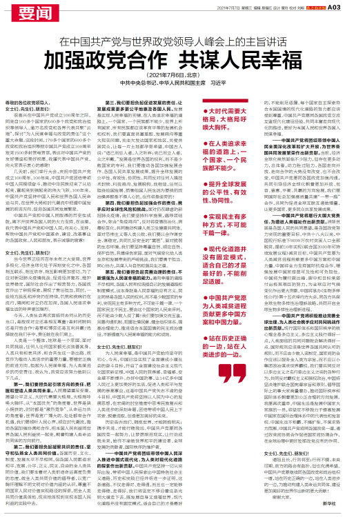 尊敬的各位政党领导人, 女士们,先生们,朋友们: 很高兴在中国共产党成立100周年之际,同来自160多个国家的500多个政党和政治组织等领导人、逾万名政党和各界