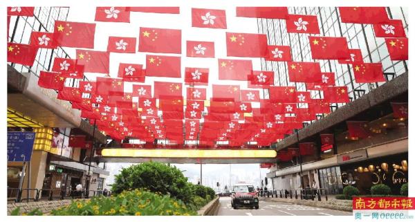 ←6月29日,在香港尖沙咀一条街上,中华人民共和国国旗和香港特别行政区区旗一起迎风飘扬。