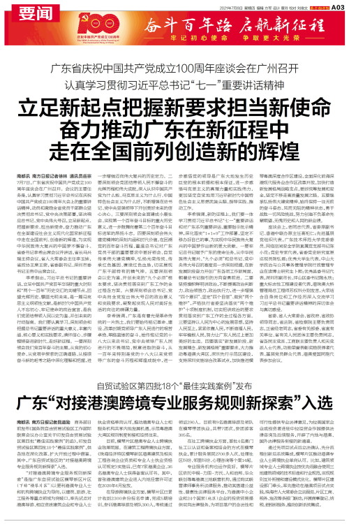 南都讯 南方日报记者徐林 通讯员岳宗 7月7日,广东省庆祝中国共产党成立100周年座谈会在广州召开。会议的主要任务是,认真学习贯彻习近平总书记在庆祝中国共产党成立100周年大会上的重要讲话精神,动