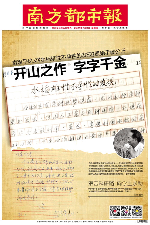 日前,袁隆平关于杂交水稻的论文——《水稻雄性不孕性的发现》原始手稿被公开,引发广泛关注。7月6日,南都记者多方采访获悉,目前这篇手稿被收藏于湖南杂交水稻研究中心档案馆内,该馆共保存了700多卷袁老