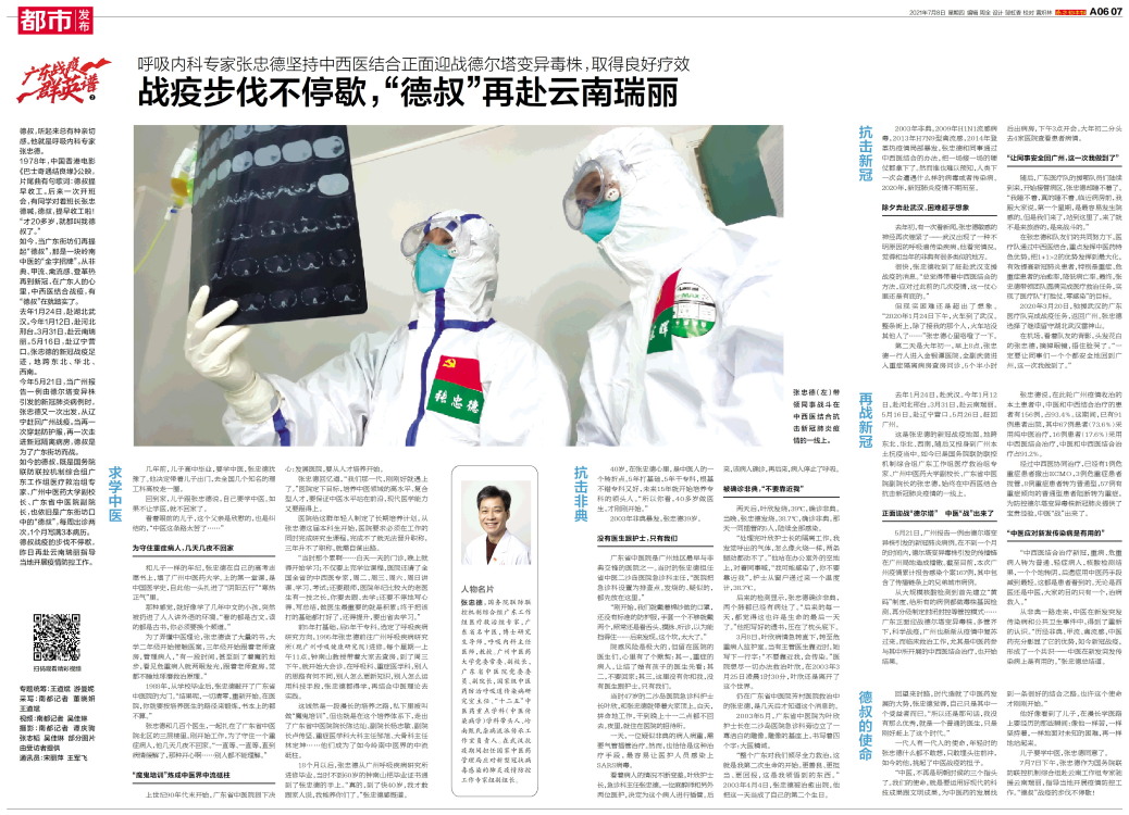人物名片 张忠德,国务院联防联控机制综合组广东工作组医疗救治组专家,广东省名中医,博士研究生导师,呼吸内科主任医师,教授。广州中医药大学党委常委、副校长,广东省中医院党委委员、副院长,国家级中医