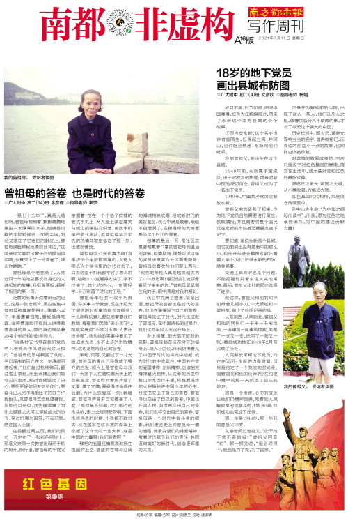 ◎广大附中 高二(14)班 余彦槿 ◎指导老师 丰莎 一晃七十二年了,真是大造化啊。曾祖母喃喃着,颤颤巍巍地拿出一本厚厚的本子,她满是沟壑的手轻轻拂去上面的尘埃,阳光又落在了它老旧的封皮上,曾祖