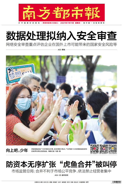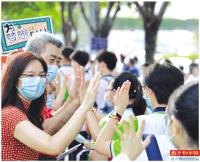 因疫情推迟的广州中考昨日开考。在华师附中考点,广州市第113中学陶育实验学校的老师与考生击掌加油。 南都记者 马强 摄