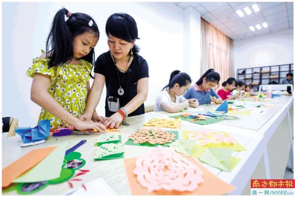 7月7日,在浙江省诸暨市暨阳街道凤凰社区的暑期爱心课堂内,作为志愿者的党员教师在辅导小学生上剪纸课。 新华社发