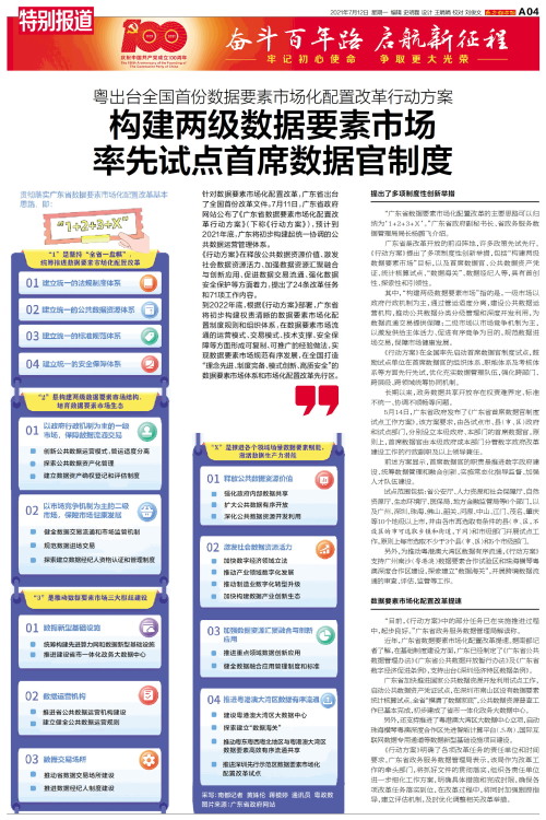 针对数据要素市场化配置改革,广东省出台了全国首份改革文件。7月11日,广东省政府网站公布了《广东省数据要素市场化配置改革行动方案》(下称《行动方案》),预计到2021年底,广东将初步构建起统一协调