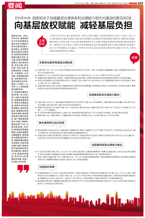 据新华社电 昨日,中共中央、国务院发布关于加强基层治理体系和治理能力现代化建设的意见。意见提出,坚持党对基层治理的全面领导,把党的领导贯穿基层治理全过程、各方面。坚持全周期管理理念,强化系统治理、