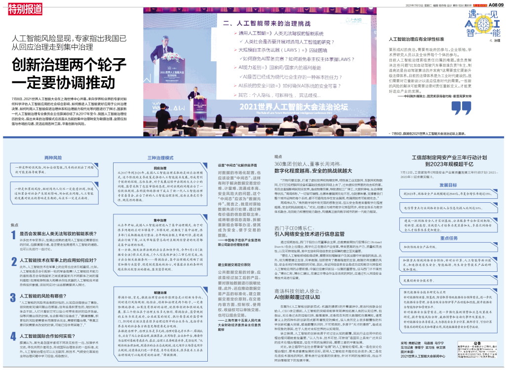 治理 7月8日,2021世界人工智能大会在上海世博中心开幕。来自学界和业界的专家对如何科学评估人工智能应用的社会综合影响、如何推进人工智能更好应用于公共治理决策、如何利用人工智能促进治理体系和治