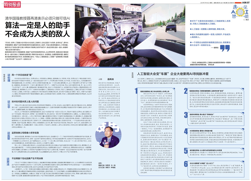 焦点 7月9日,世界人工智能大会可信AI分论坛在上海举行,论坛主题为“AI向善,全球共治”。清华大学国强教授、智能产业研究院首席研究员聂再清在会上表示,可信AI就是有爱的AI。只有有爱,最终可以