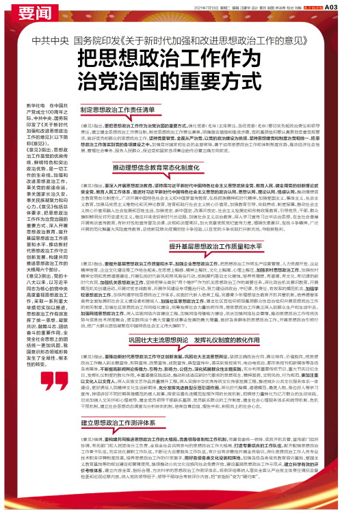 新华社电 在中国共产党成立100周年之际,中共中央、国务院印发了《关于新时代加强和改进思想政治工作的意见》(以下简称《意见》)。《意见》指出,思想政治工作是党的优良传统、鲜明特色和突出政治优势,是