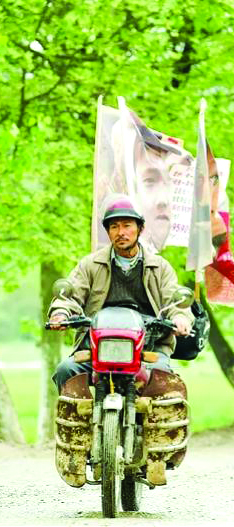 郭刚堂说,他还有寻子的使命要完成,于是慢慢从地上爬起来,扶起摩托车,也扶正了那面“寻子旗”,继续推车前行。