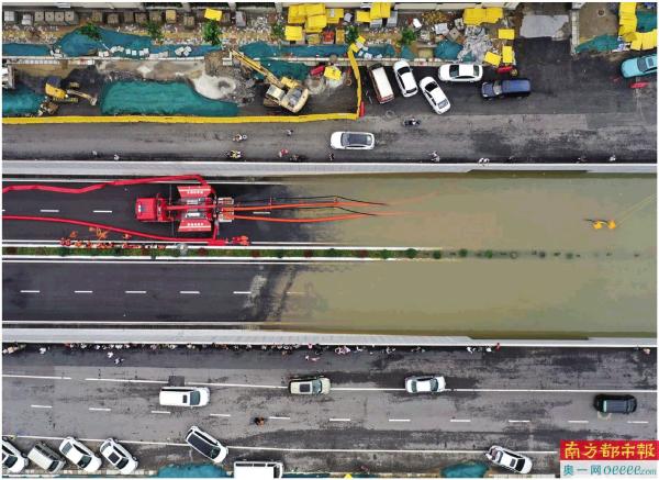 7月21日,在郑州市桐柏路附近拍摄的排涝现场。 新华社发