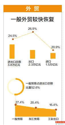其中,出口2.3万亿元,同比增长26.9%,两年平均增长7.7%;进口1.5万亿元,同比增长20.9%,两年平均增长7.1%。一般贸易进出口较快恢复。同比增长27.4%,占进出口总额比重为52.6%。