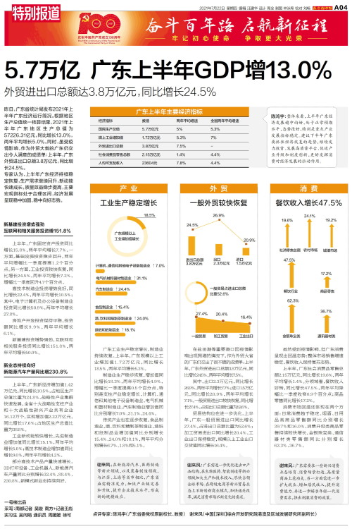 昨日,广东省统计局发布2021年上半年广东经济运行简况。根据地区生产总值统一核算结果,2021年上半年广东地区生产总值为57226.31亿元,同比增长13.0%,两年平均增长5.0%。同时,虽受疫