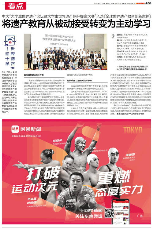 7月17日,《全球世界遗产教育创新案例》发布,中山大学旅游学院申报的“大学生世界遗产论坛暨大学生世界遗产保护提案大赛”因“以竞赛激发学生主动探究,跨界合作提出创新保护方案服务遗产地发展”而成为全球
