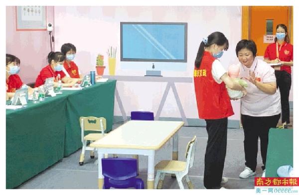 谢萍告诉南都记者,此次育婴员考试总时长是40分钟,项目主要分为三部分,首先是营养保健和健康管理,会评估宝宝的健康情况以及做一些简单的小儿推拿;其次是生活照料,培养宝宝正确的生活习惯和饮食习惯;第三部分是教育实施,通过对宝妈的指导实现家庭早教功能。