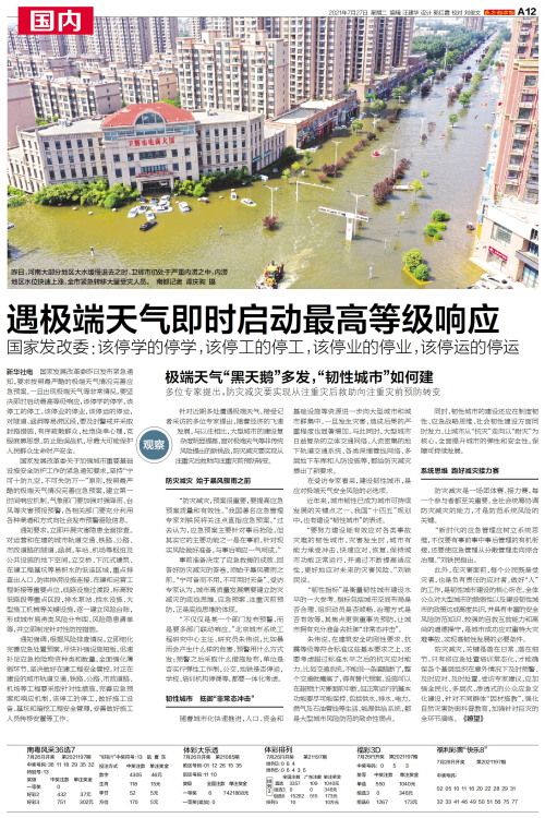 观察 针对近期多处遭遇极端天气,接受记者采访的多位专家提出,随着经济的飞速发展,与以往相比,大型城市的建设复杂度明显提高,面对极端天气等非传统风险提出的新挑战,防灾减灾要实现