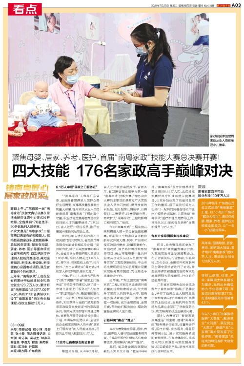 昨日上午,广东省第一届“南粤家政”技能大赛总决赛在肇庆市新区体育中心正式拉开帷幕。全省共有176名选手、90多名裁判人员参赛。本次大赛是“南粤家政”工程实施以来举办的规模最大、规格最高的家政职业技