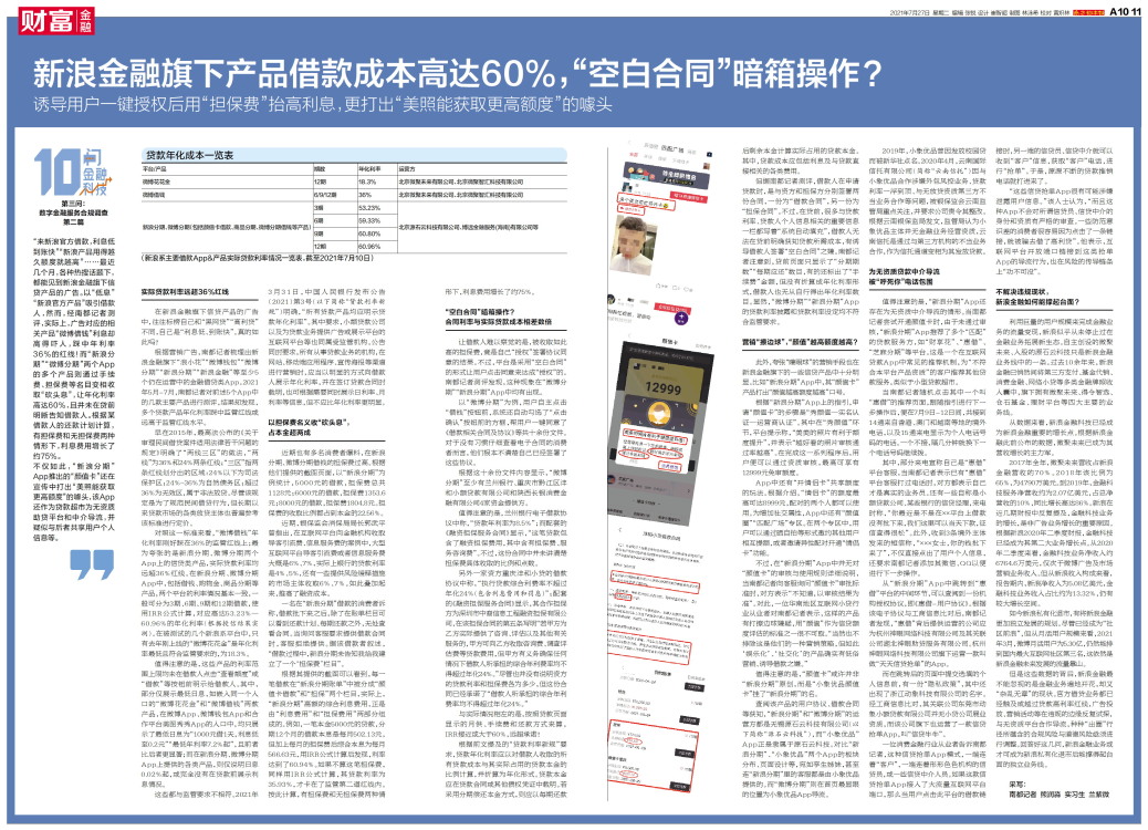 第三问: 数字金融服务合规调查 第二篇 “来新浪官方借款,利息低到账快”“新浪产品用得越久额度就越高”……最近几个月,各种热搜话题下,都能见到新浪金融旗下信贷产品的广告。以“低息”“新浪官方产品
