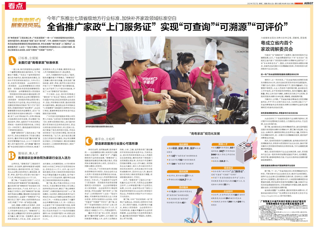 自“南粤家政”工程实施以来,广东紧紧围绕“一老一小”对家政服务的迫切需求,坚持问题导向,推动家政“短板”成为“潜力板”。今年,省商务厅也发布了《家政服务员信用信息管理规范》等信用类标准,并在全省推