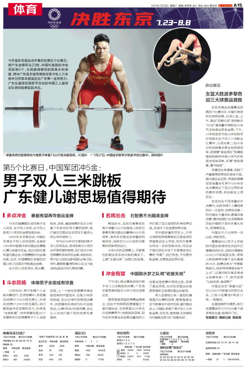 今天是东京奥运会开幕后的第五个比赛日,将产生金牌多达23枚。中国代表团的冲金项目有5个,尤其值得期待的是跳水和举重,其中广东选手谢思埸将在男子双人三米板中为夺取本届奥运会广东第一金而努力。广东女篮
