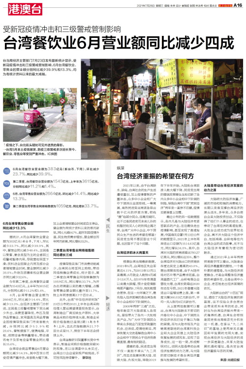 民生 台当局经济主管部门7月23日发布最新统计显示,受新冠疫情冲击和三级警戒管制影响,6月台湾餐饮业、零售业的营业额分别同比减少39.9%和13.3%,均为有统计资料以来的最大减幅。 6月台湾