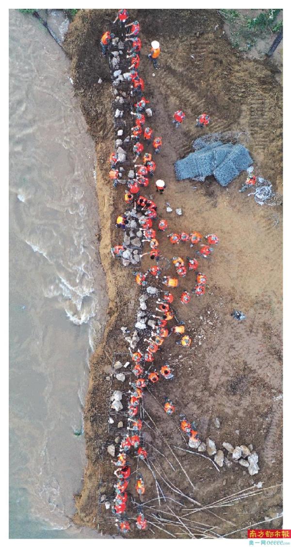 ←7月25日,河南鹤壁市浚县,解放军利用钢筋笼对卫河决堤口进行加固。