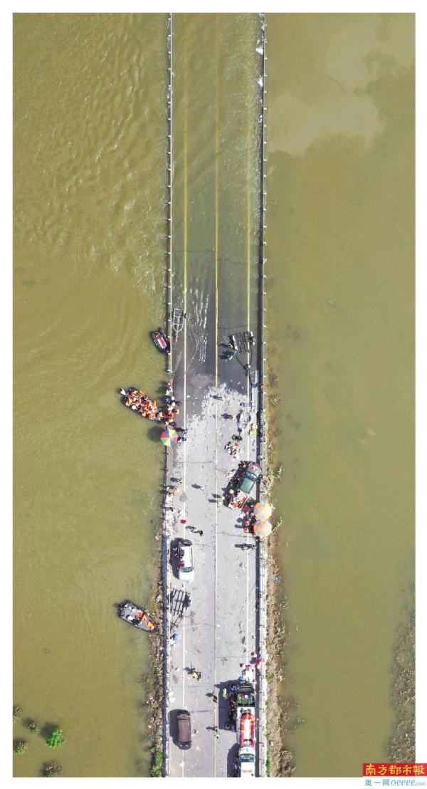 ←7月26日,河南卫辉市,牧野大桥的两端成了临时的救援码头。