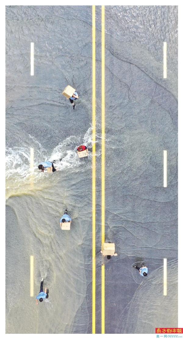 ←7月24日,河南郑州中牟县阜外华中心血管医院外,志愿者蹚过积水路面搬运物资。