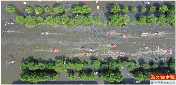 ↑7月26日,河南卫辉市,城区的主干道成了救援船只的水路。