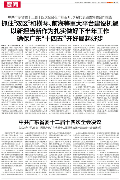 中国共产党广东省第十二届委员会第十四次全体会议于2021年7月28日在广州召开。全会由省委常委会主持。全会以习近平新时代中国特色社会主义思想为指导,全面贯彻落实党的十九大和十九届二中、三中、四中、