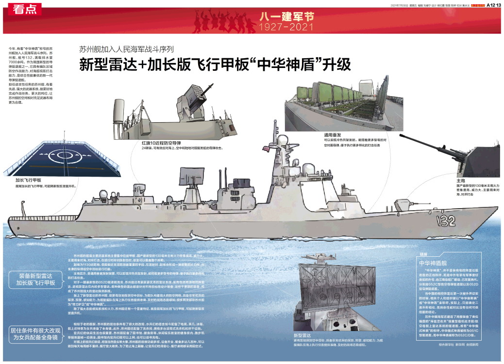 主炮 国产最新型的130毫米主炮火力密集度高、威力大,主要用来对海、对岸打击 加长飞行甲板 舰尾加长的飞行甲板,可起降新型反潜直升机。