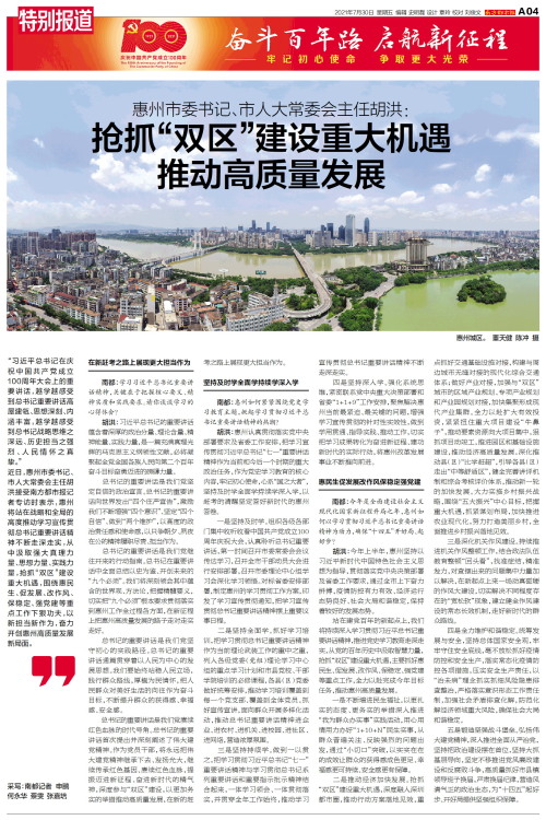 “习近平总书记在庆祝中国共产党成立100周年大会上的重要讲话,越学越感受到总书记重要讲话高屋建瓴、思想深刻、内涵丰富,越学越感受到总书记战略思维之深远、历史担当之强烈、人民情怀之真挚。”近日,惠州