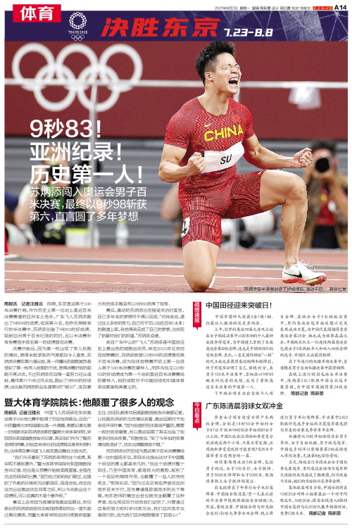 南都讯 记者汪雅云 中国飞人苏炳添在东京奥运男子100米比赛中取得了历史性突破后,远在广州的暨南大学校园里也是一片沸腾。南都记者也第一时间联系到苏炳添供职的暨南大学体育学院,学院院长彭国雄教授告诉记者,其实他们作为了解苏老师的同事,对他百米9秒83的成绩其实是有所预料的,也非常自豪中国飞人能在奥运舞台大放光芒。