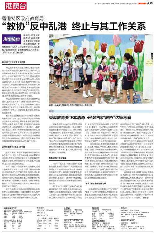 南都讯 见习记者杨苓妍 南都记者从香港特区政府教育局官网获悉,香港教育局于7月31日起全面终止与长期从事反中乱港活动的“香港教育专业人员协会”(简称“教协”)的工作关系。 言论和行径与教育专业不
