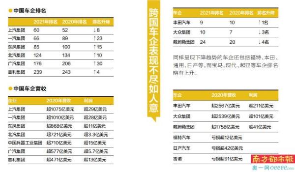 记者注意到,中国车企在这次世界500强榜单中的排名有所提升,除上汽集团从2020年的第52名下降至60名外,一汽、东风、北汽、中国兵器工业集团、广汽都有所提升。