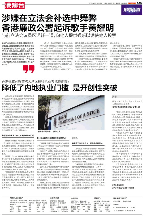南都记者从香港特区廉政公署官网获悉,8月2日,该署落案起诉前香港立法会议员区诺轩与歌手黄耀明,控告二人涉嫌在2018年立法会补选中舞弊,包括向他人提供娱乐以诱使他人投票。该案将于8月5日在香港东区