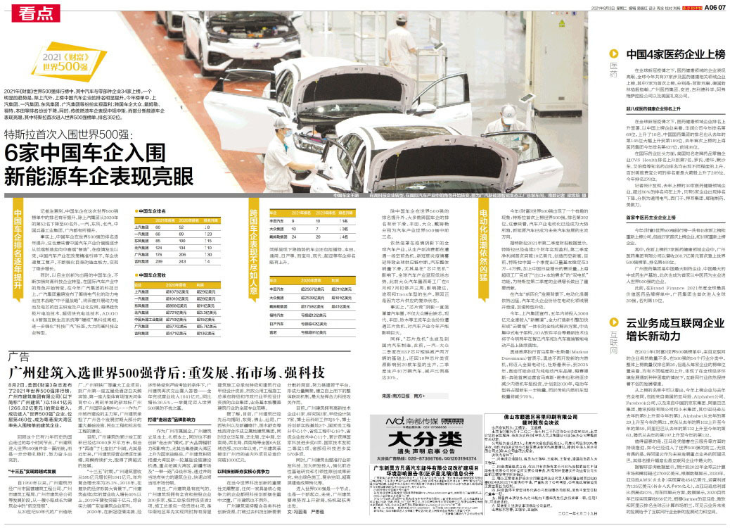 专题 8月2日,美国《财富》杂志发布了2021年世界500强排行榜,广州市建筑集团有限公司(以下简称“广州建筑”)以1841亿元(266.82亿美元)的营业收入,成功进入“世界500强”企业,位