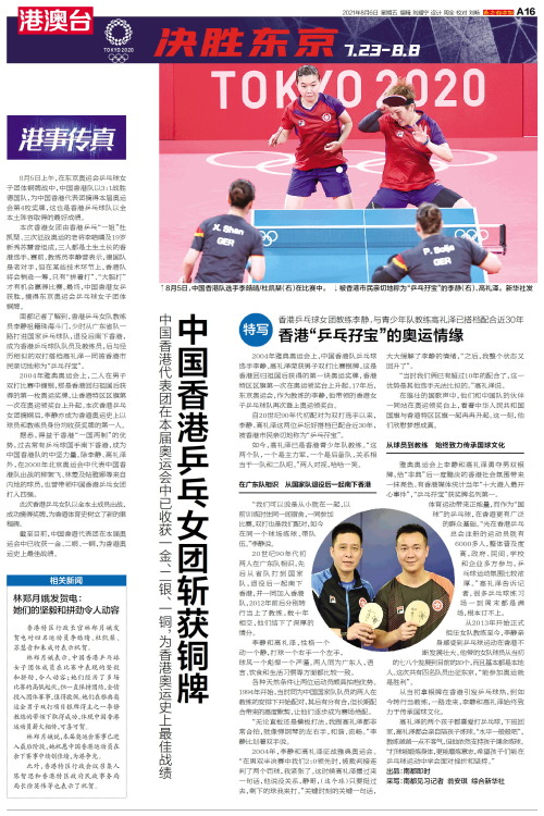 8月5日上午,在东京奥运会乒乓球女子团体铜牌战中,中国香港队以3:1战胜德国队,为中国香港代表团摘得本届奥运会第4枚奖牌,这也是香港乒乓球队以全本土阵容取得的最好成绩。