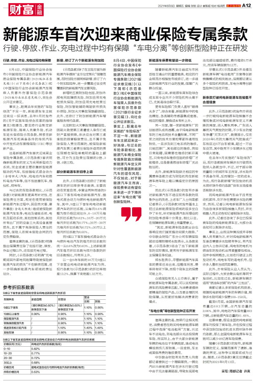 8月4日,中国保险行业协会发布《中国保险行业协会新能源汽车商业保险专属条款(2021版征求意见稿)》(以下简称《示范条款》)和《中国保险行业协会新能源汽车驾乘人员意外伤害保险示范条款(2021版行