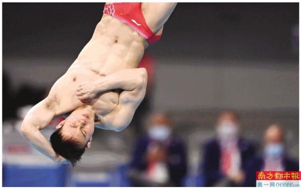 8月3日,在东京奥运会跳水男子三米板决赛中,中国选手谢思埸获得冠军,王宗源获得亚军。图为谢思埸在比赛中。