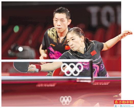 7月25日,在东京奥运会乒乓球混双半决赛中,中国组合许昕/刘诗雯(前)以4比0战胜法国组合莱贝松/袁嘉楠,晋级决赛。