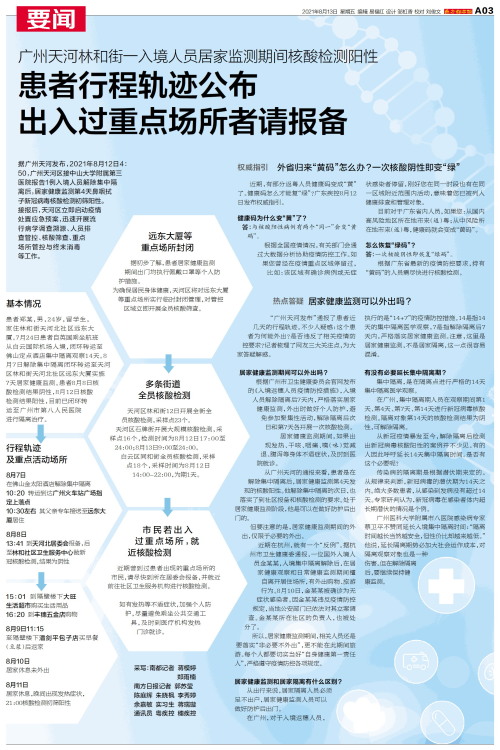 据广州天河发布,2021年8月12日4:50,广州天河区接中山大学附属第三医院报告1例入境人员解除集中隔离后,居家健康监测第4天鼻咽拭子新冠病毒核酸检测初筛阳性。接报后,天河区立即启动疫情处置应急