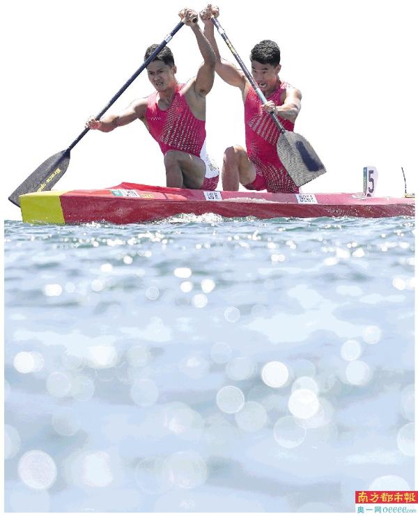 8月3日,中国选手刘浩(左)、郑鹏飞在静水皮划艇男子1000米双人划艇比赛中。