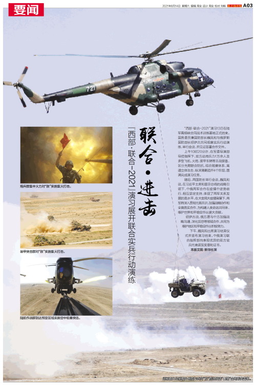 “西部·联合-2021”演习13日在陆军青铜峡合同战术训练基地正式结束。国务委员兼国防部长魏凤和与俄罗斯国防部长绍伊古共同观摩实兵行动演练、举行会谈,并见证签署合作文件。 上午10时20分许,在